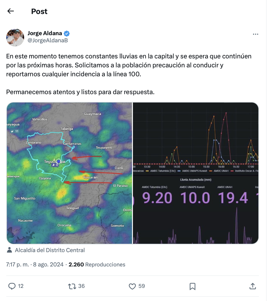 El alcalde del Distrito Central, Jorge Aldana, hizo un llamado a la población para que extremen precauciones debido a las intensas lluvias que están afectando la capital. Según Aldana, se espera que las precipitaciones continúen en las próximas horas, por lo que pide a los conductores que manejen con cuidado y reporten cualquier incidente a la línea 100.