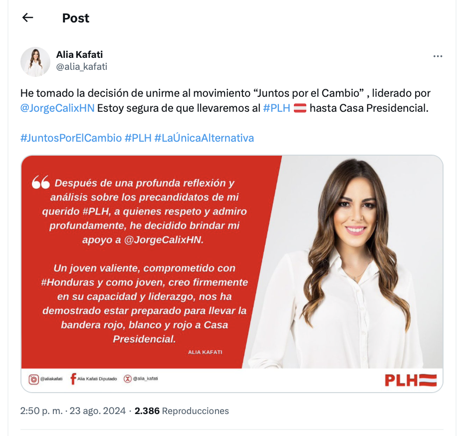 A través de sus redes sociales, Kafati, quien ha sido una figura clave en la promoción de la participación femenina en la política hondureña, declaró su intención de trabajar para llevar al Partido Liberal a la Casa Presidencial.