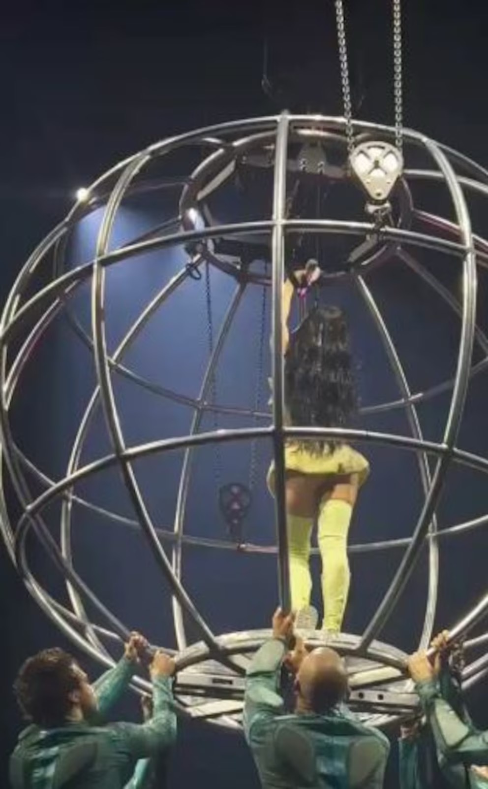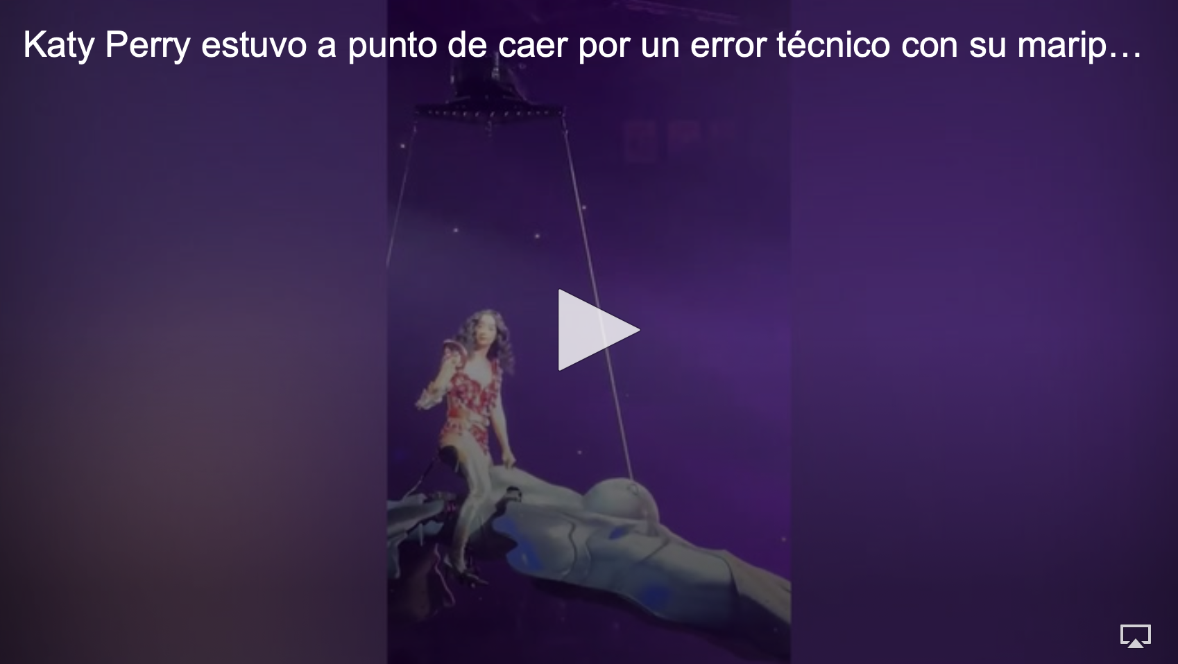 Como se aprecia en el video, la mariposa voladora que forma parte del espectáculo visual de la gira, se inclinó y descendió súbitamente. Ello propició a que la artista resbalara en su asiento y luchara para conservar al equilibrio mientras el público, bajo el artefacto, observaba la escena con terror.