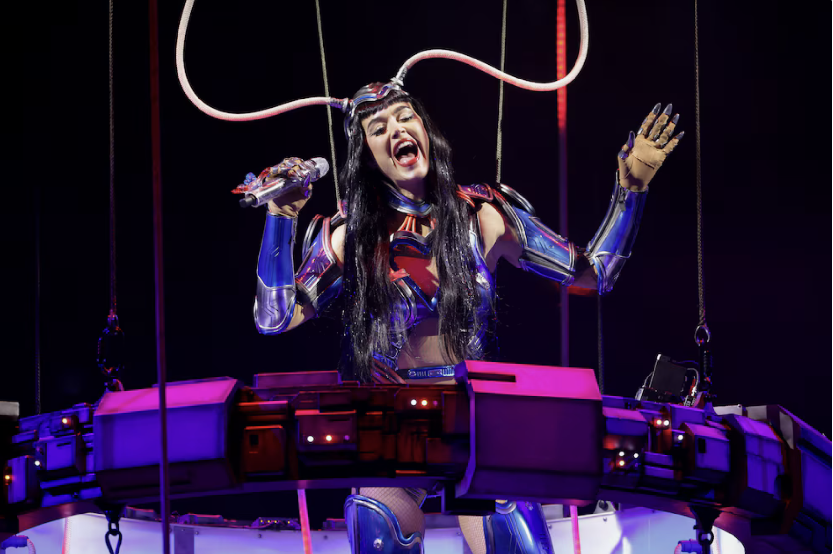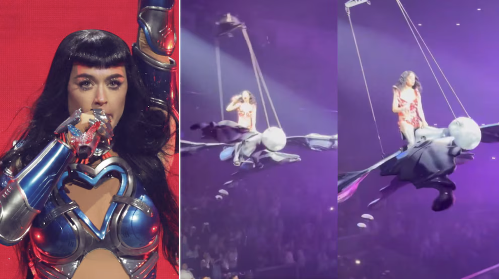 Mientras interpretaba “Roar”, el artefacto aéreo descendió abruptamente y la dejó balanceándose sobre el público (Reuters/captura de video)