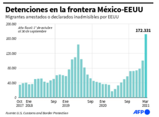 Las cifras en la frontera “han estado al alza desde abril de 2020 debido a razones que incluyen la violencia, los desastres naturales, la inseguridad alimentaria y la pobreza en México y en los países del Triángulo Norte de América Central”, indicó la patrulla fronteriza.
