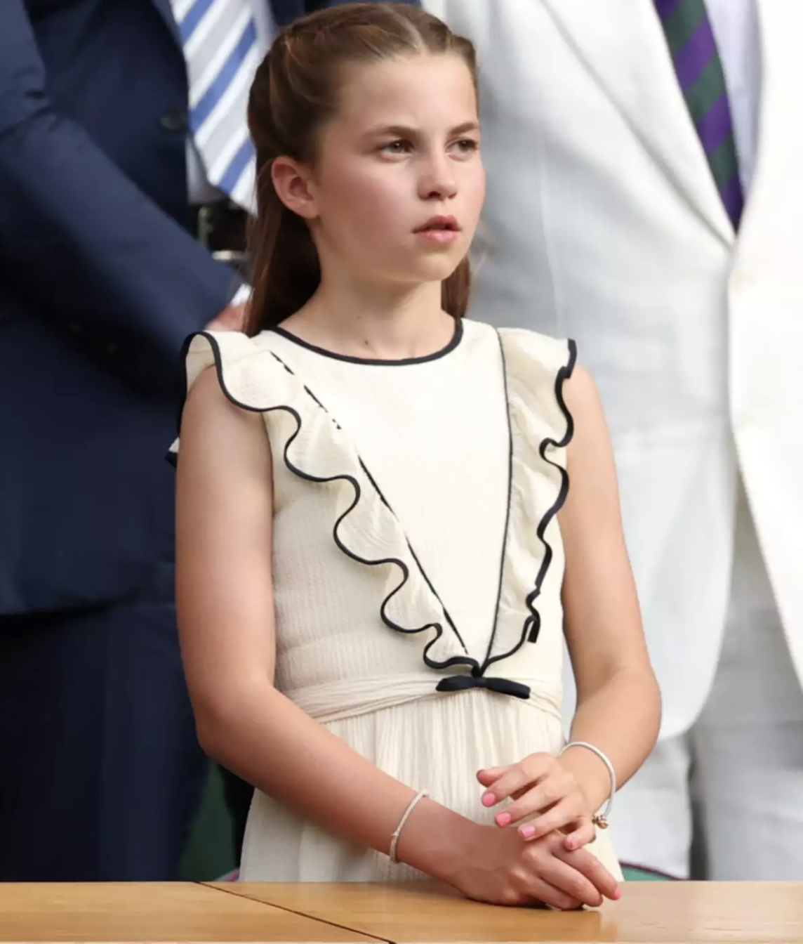 En el look de Charlotte, el contraste funciona: vestido blanco de olanes, detalles azul marino, lazos delicados en el pelo y ese toque de color en las uñas que se convirtió en su verdadero accesorio statement. Como guiño final, Charlotte combinó su manicura con una pulsera Pandora plateada y un charm verde esmeralda; pequeños amuletos con gran carga simbólica.