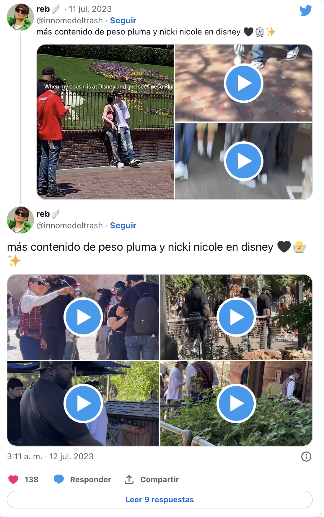 En redes sociales y, en especial en TikTok, comenzaron a circular distintos videos grabados en Disney de California, en los que se ve juntos a Peso Pluma y Nicki Nicole acompañados por guardaespaldas, mientras disfrutan de las atracciones del parque, además de usar gorras y comer paletas de hielo con las características orejas de Mickey Mouse.