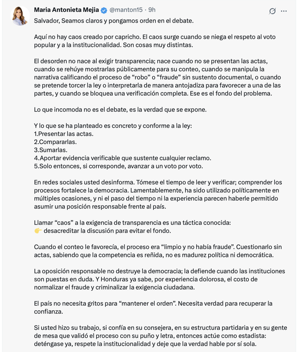 Mejía señaló que las acusaciones de Nasralla carecen de respaldo documental y calificó sus publicaciones como desinformación. “En redes sociales usted desinforma. Tómese el tiempo de leer y verificar; comprender los procesos fortalece la democracia”, escribió.